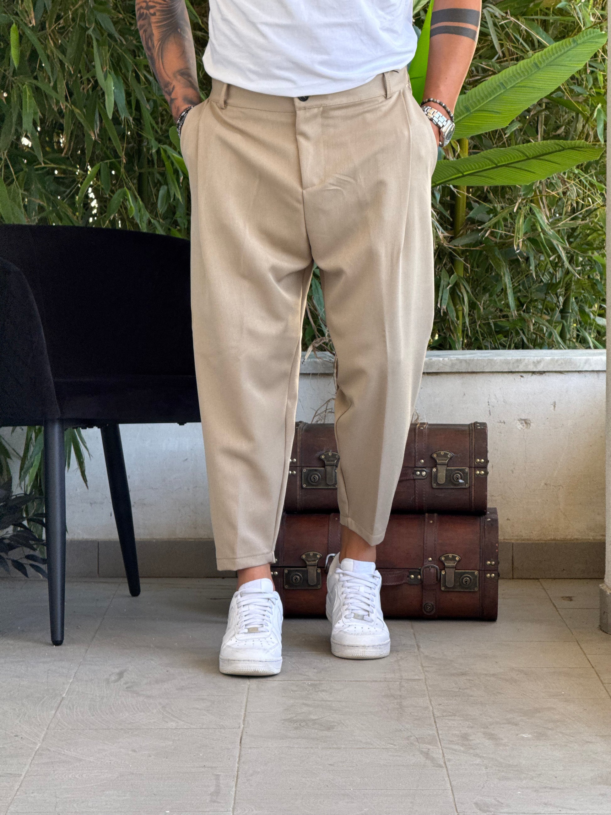 Il *pantalone Kid* è la scelta perfetta per chi ama un look versatile e contemporaneo. Realizzato con cura dal *New Job Brand*, presenta un *bottone in vita* e *pence frontali* che donano struttura e stile al capo.