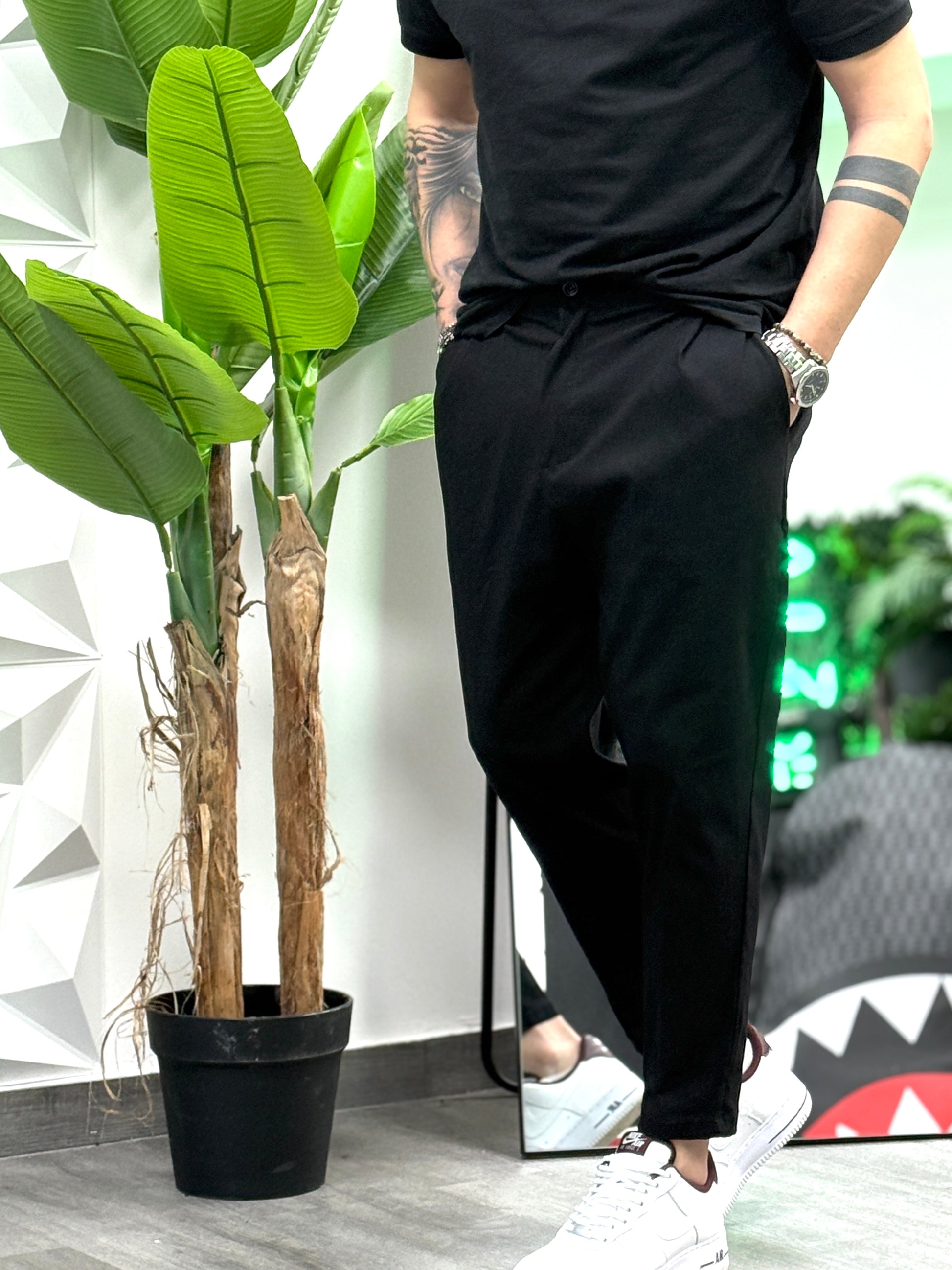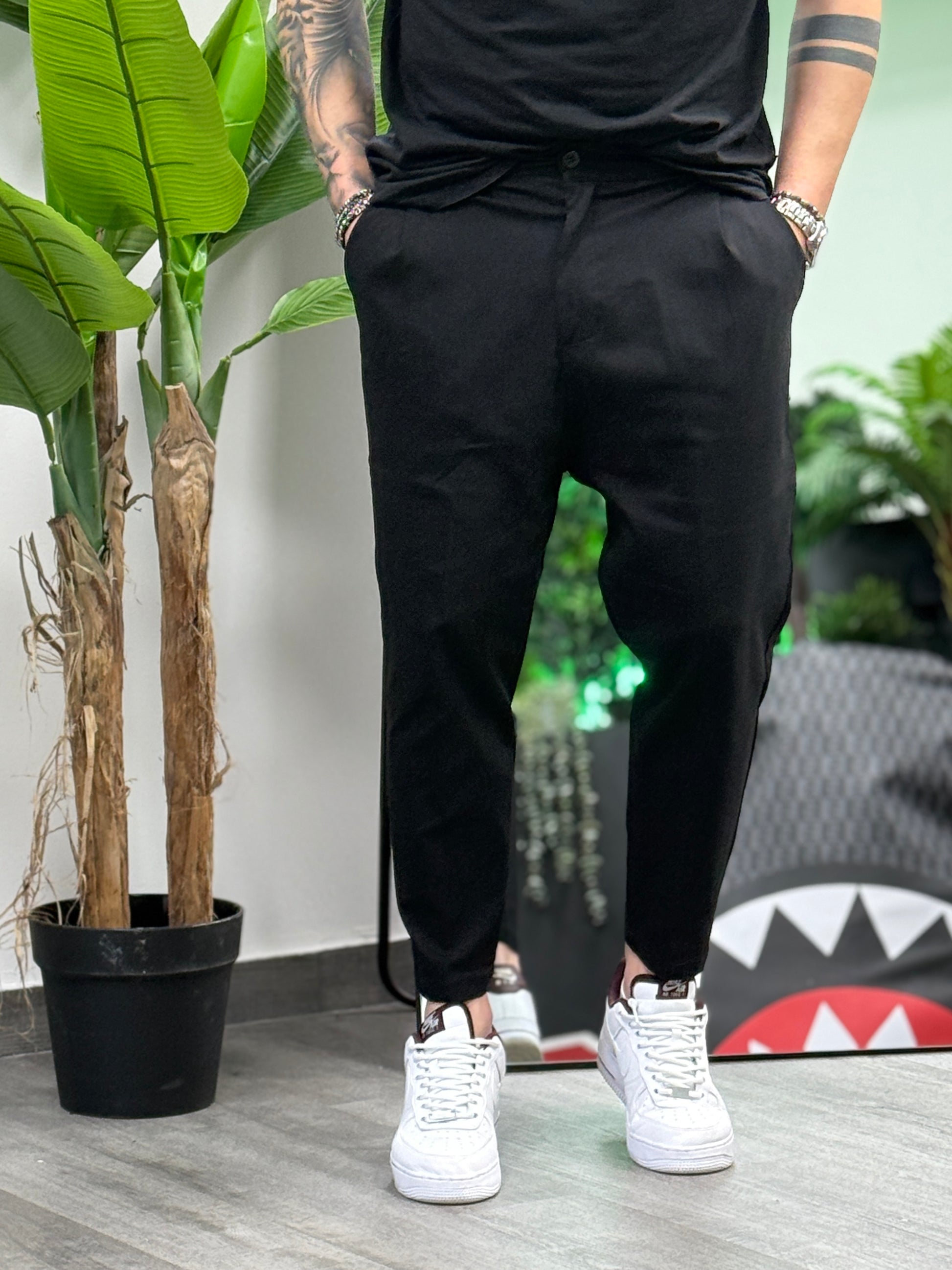 La sua *vestibilità morbida* lo rende comodo per l’intera giornata, mentre il taglio che *si restringe sul fondo* gli conferisce una silhouette moderna e affusolata. È il pantalone ideale per chi vuole passare da un look *casual* a uno *elegante o sportivo*,