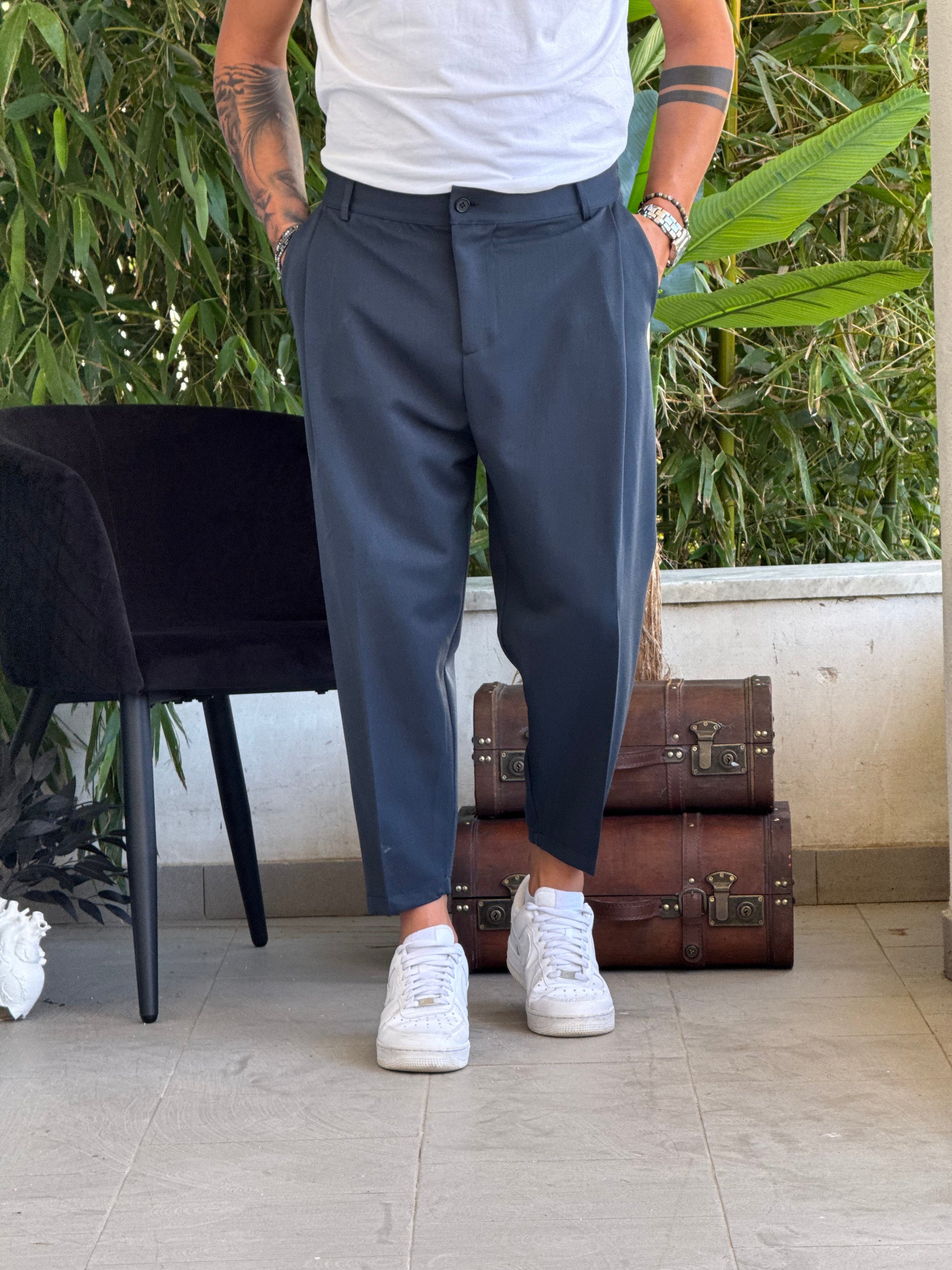 Il *pantalone Kid* è la scelta perfetta per chi ama un look versatile e contemporaneo. Realizzato con cura dal *New Job Brand*, presenta un *bottone in vita* e *pence frontali* che donano struttura e stile al capo.